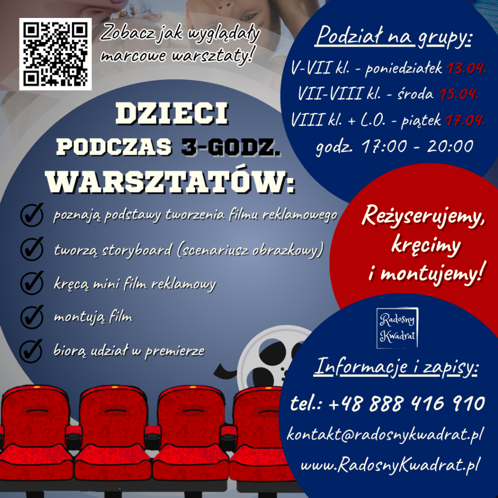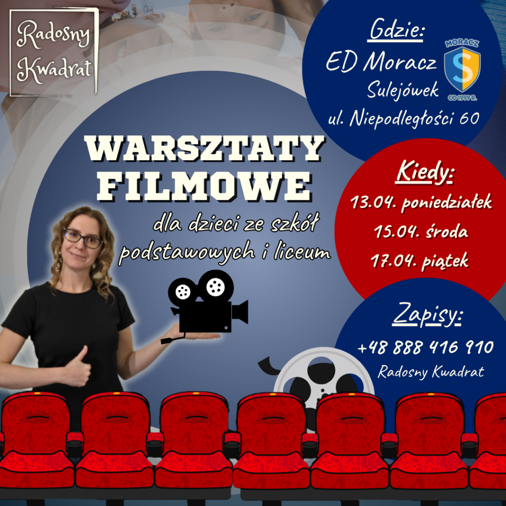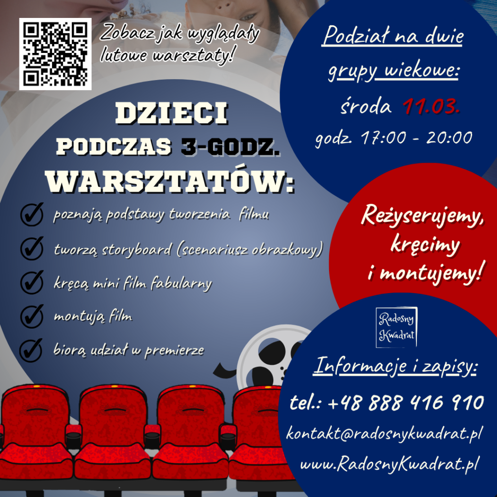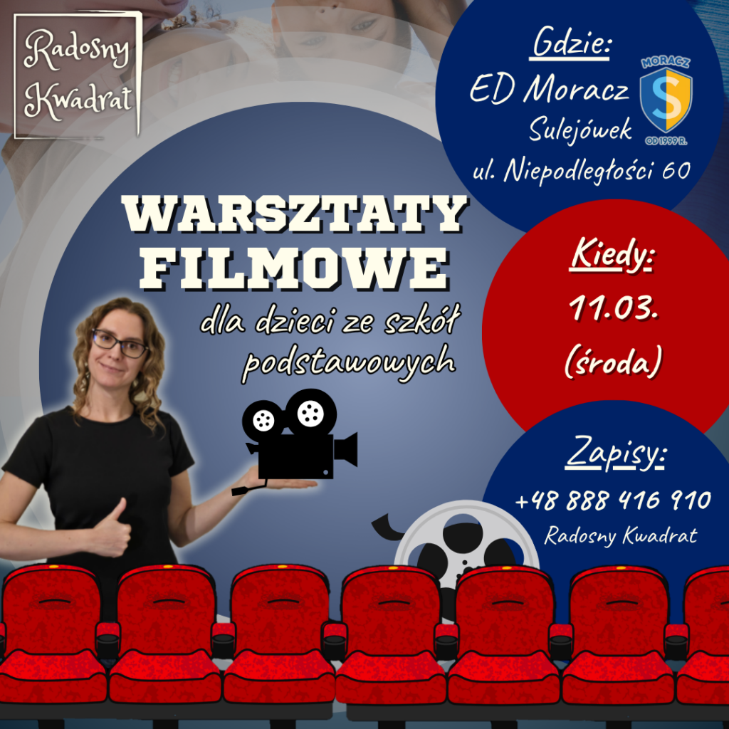 Zapraszamy dzieci (zarówno ze szkół stacjonarnych, jak i z edukacji domowej) na 3-godzinne warsztaty filmowe, podczas których zamienią się w prawdziwą ekipę filmową – od pomysłu aż po premierę 🎥✨